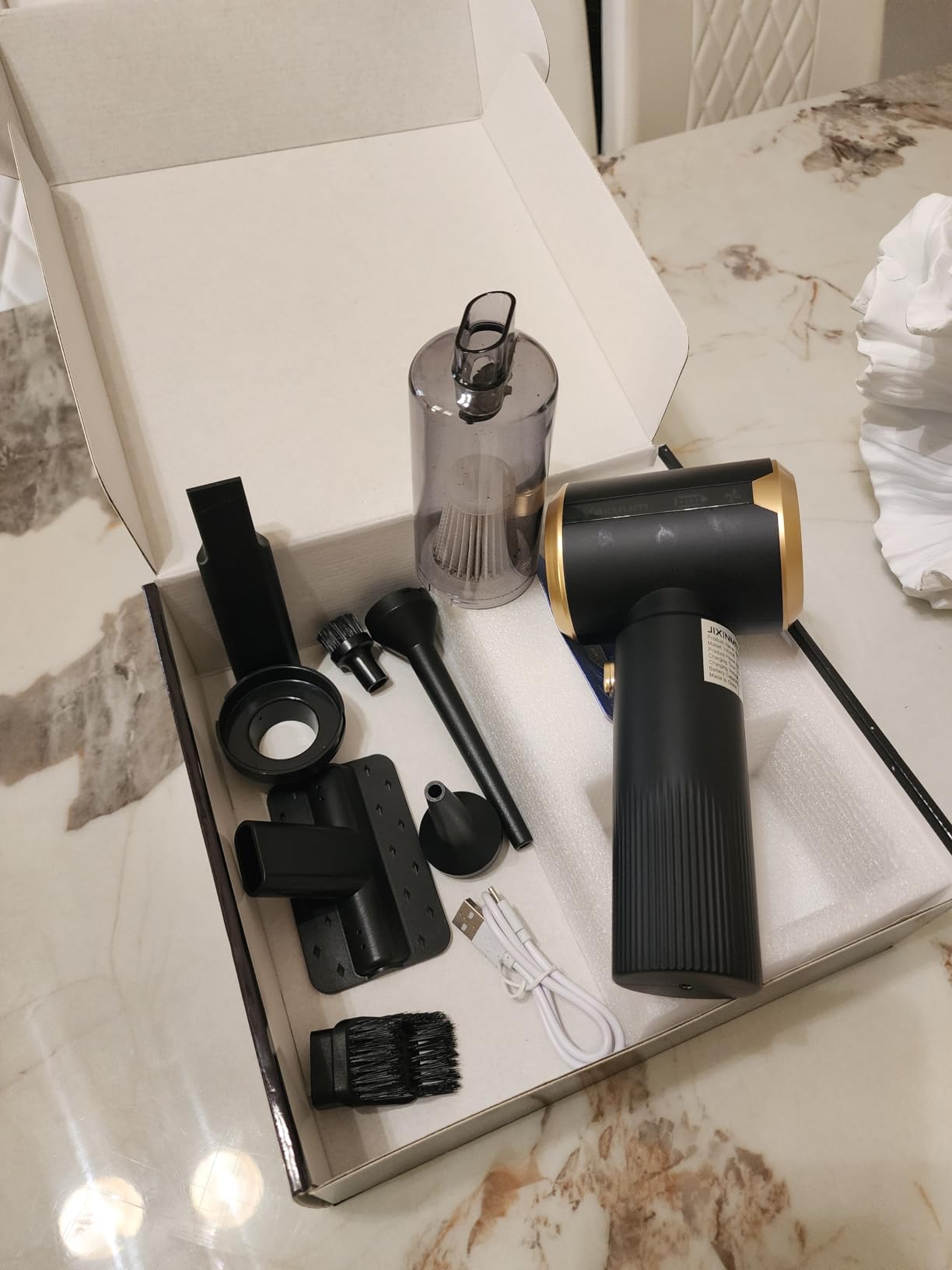 Yes, it includes multiple nozzle attachments to clean narrow gaps, corners, air vents, and upholstery efficiently.